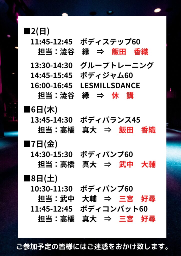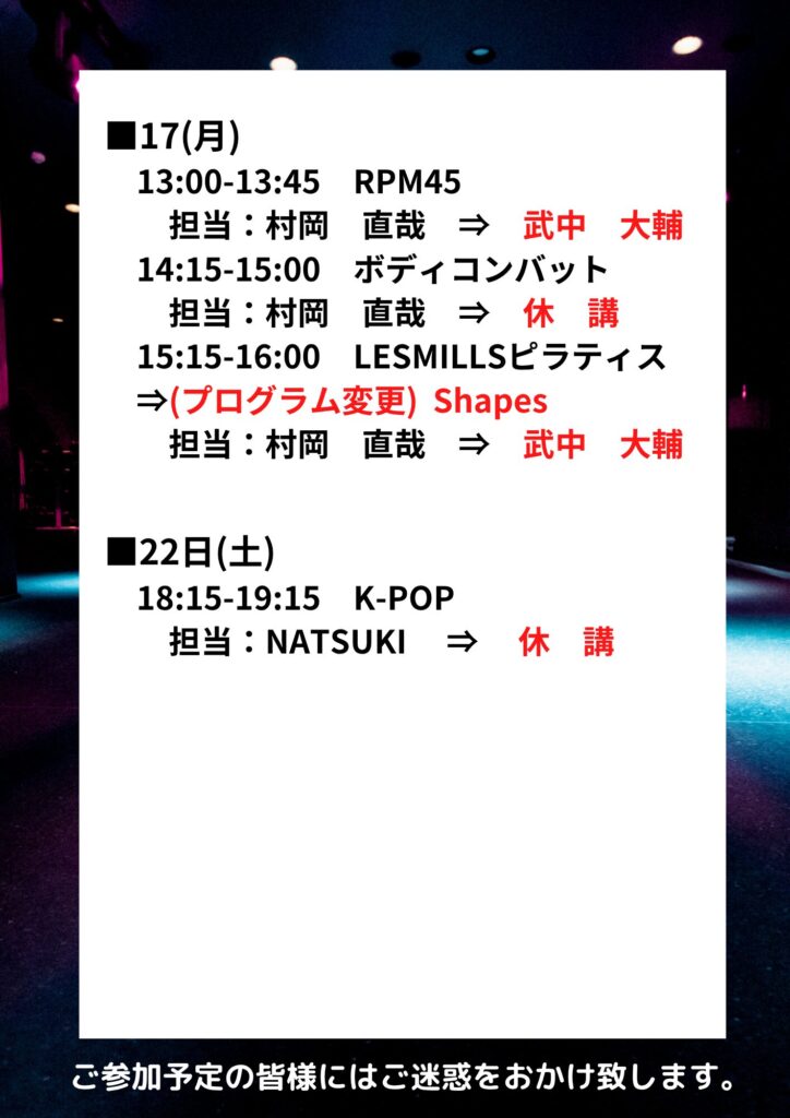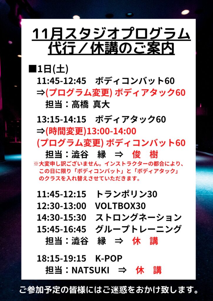 ※11/1(土)12:45-ボディコンバット及び、13:15-ボディアタックのクラスにつきまして、この日に限り、通常タイムスケジュールより「プログラムを入れ替えて」のご提供とさせていただきます。ボディコンバットの開始時間も13:00-と時間変更にもなっておりますので、お間違えのないようご参加ください。
