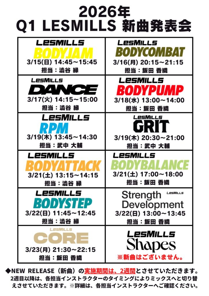 2026年 Q1 LESMILLS 新曲発表会スケジュール